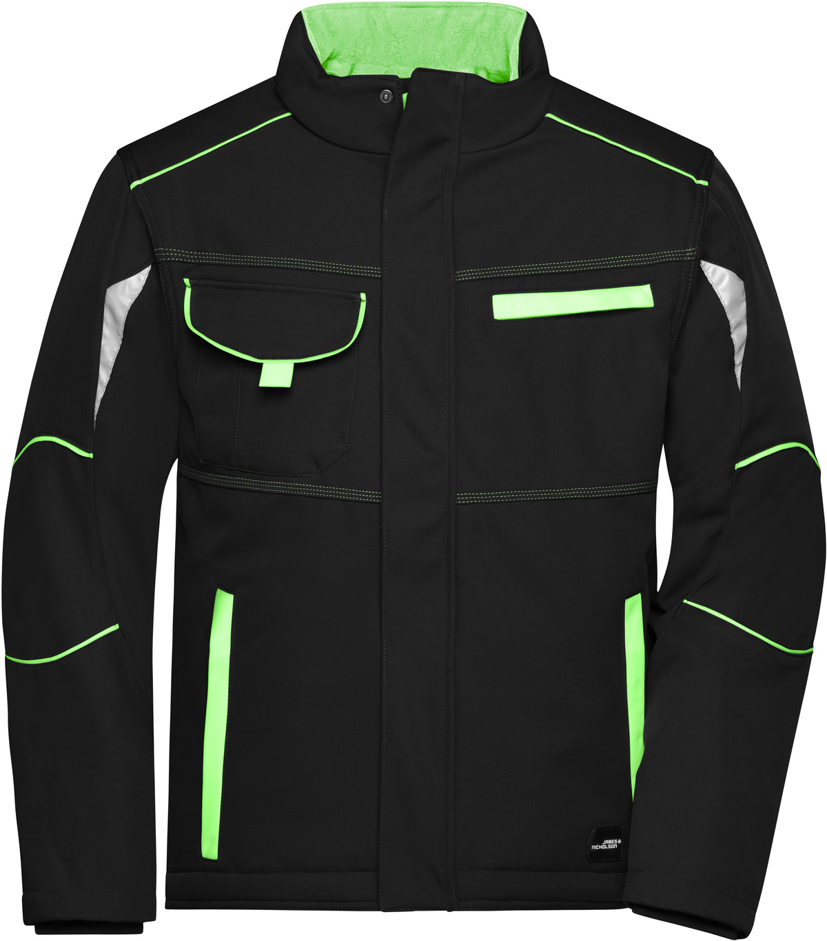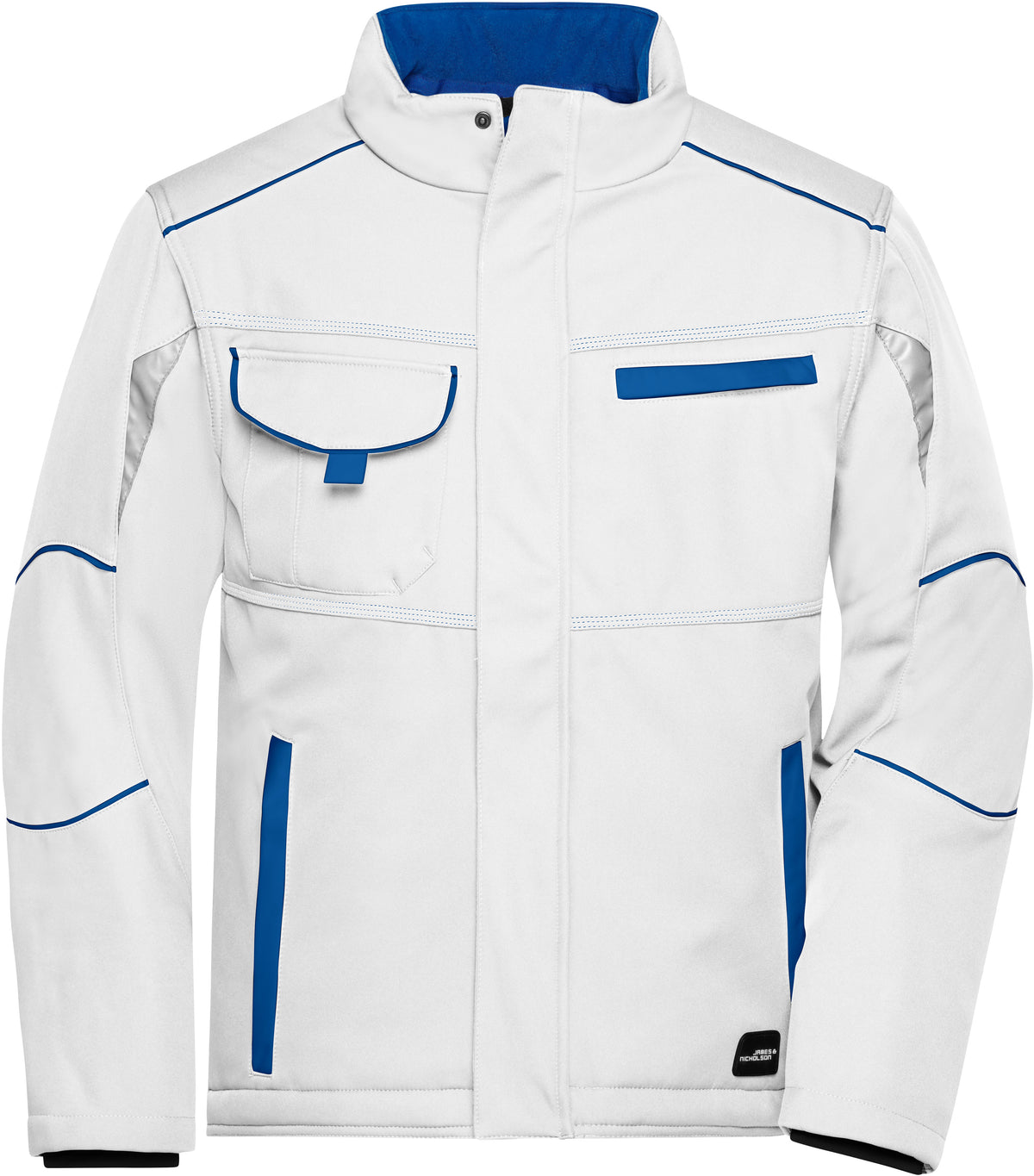 Wind- und wasserabweisend (2.000mm Wassersäule), atmungsaktiv und wasserdampfdurchlässig (2.000g/m² in 24h), Stehkragen innen mit weichem Fleece, ergonomisch geformte Ärmel, innenliegende wärmende Ärmelbündchen, durchgehend unterlegter Reißverschluss mit Windschutzblende und Kinnschutz, verdeckte Verarbeitung an Knöpfen und Reißverschlüssen, Seitentaschen, Brusttasche und Innentasche mit Reißverschluss, Brusttasche mit Klappe, Handytasche innen, länger geschnittener Rücken, Veredelungszugang am Rücken, robustes und strapazierfähiges Softshellmaterial, Reflexelemente (ohne Schutzfunktion) an den Ärmeln und Rückenteil, 30° waschbar, nicht bügeln, nicht trocknergeeignet