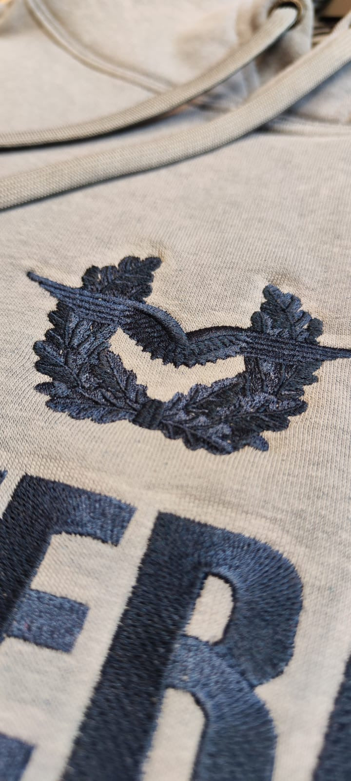 Material: 310-320 g/m², 70 % algodón hilado en anillos, 30 % poliéster, teñido doble
