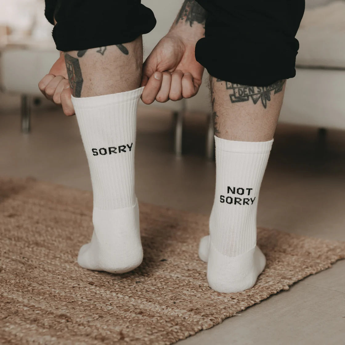 Diese Socken aus weicher Bio-Baumwolle bringen nicht nur Komfort, sondern auch eine ordentliche Portion Charakter mit sich. Der Sorry not Sorry Schriftzug an der Ferse sorgt für den perfekten Augenzwinkermoment – frech blitzt er über den Sneakern hervor und sagt genau das, was du denkst. Für alle, die sich nicht verbiegen lassen.