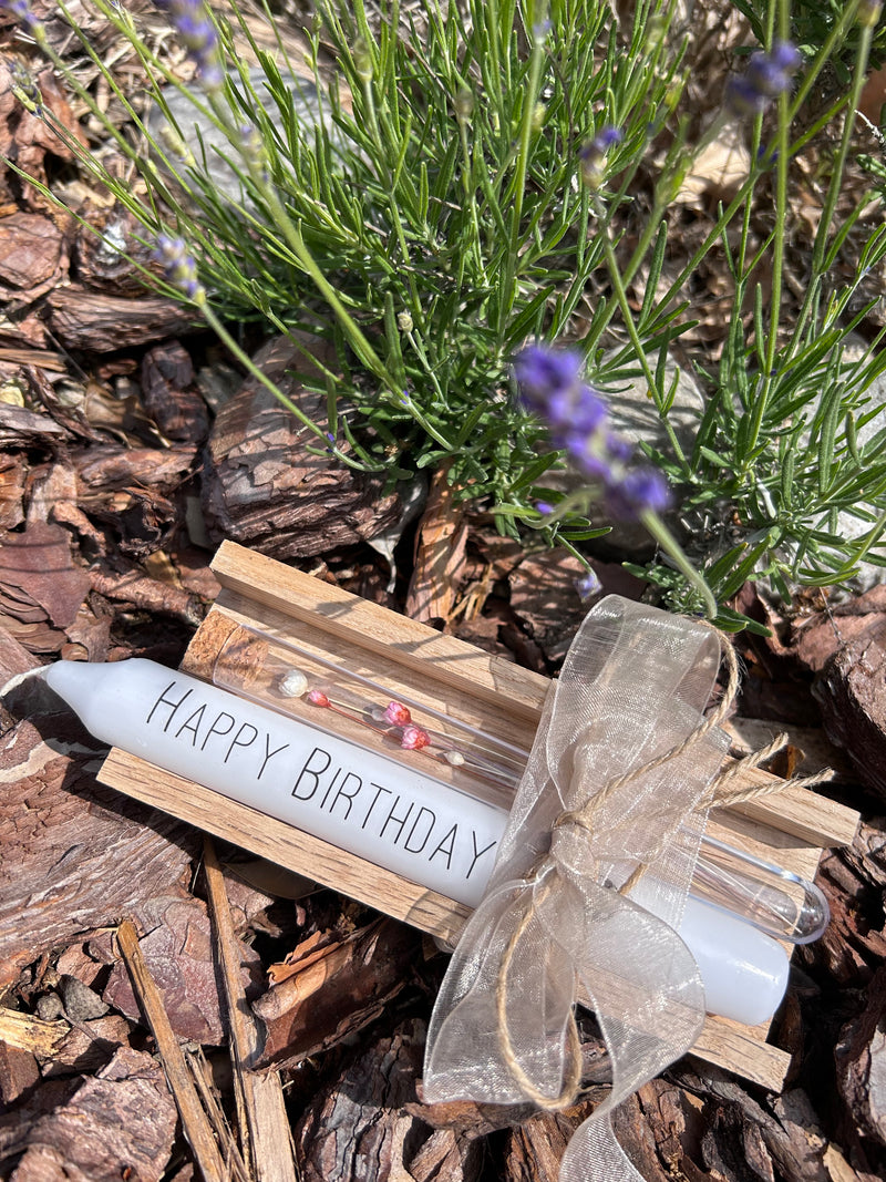 “Feliz cumpleaños”: caja de madera con tubo de ensayo y vela impresa