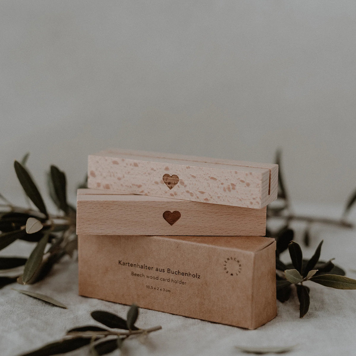 ¿Ya has descubierto nuestro set de dos soportes para tarjetas fabricados en madera de haya? El pequeño corazón en el frente impresiona con su diseño minimalista pero divertido. La parte posterior del tarjetero está decorada con un pequeño logotipo de Eulenschnitt. El espacio fresado en la madera crea un soporte perfecto para tus pertenencias favoritas. Esto hace que sea fácil cambiar cosas rápidamente cuando quieras. El formato pequeño es perfecto para tus fotografías, postales e imágenes pequeñas favoritas. Nuestros soportes para tarjetas en juego de dos también son ideales para usar en bodas y ocasiones especiales, como soporte para los números de mesa de un plano de asientos.