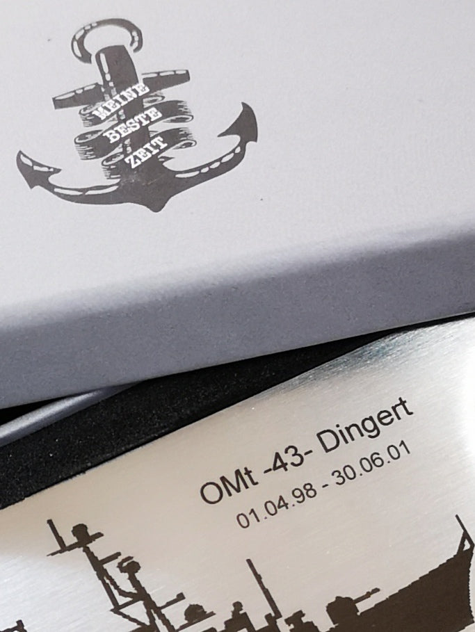 Auf der Vorderseite befindet sich eine lasergravierte Silhouette des Schiffs