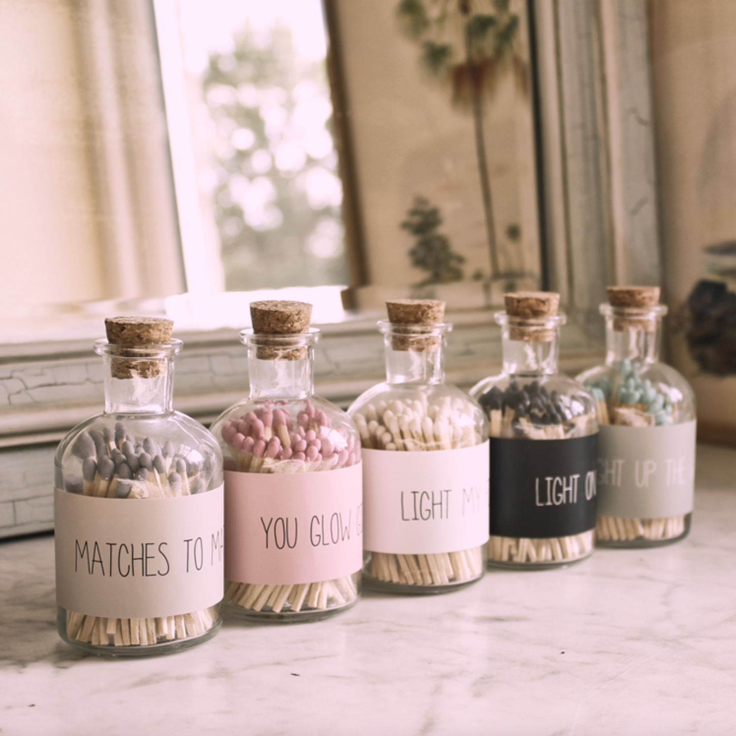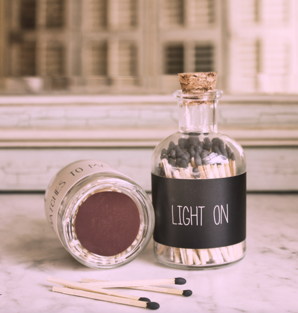 Un frasco con 80 cerillas negras. Con estas cerillas tú y tus velas a juego estaréis totalmente a la moda. En el cristal encontrarás el texto “Ilumina el mundo”.