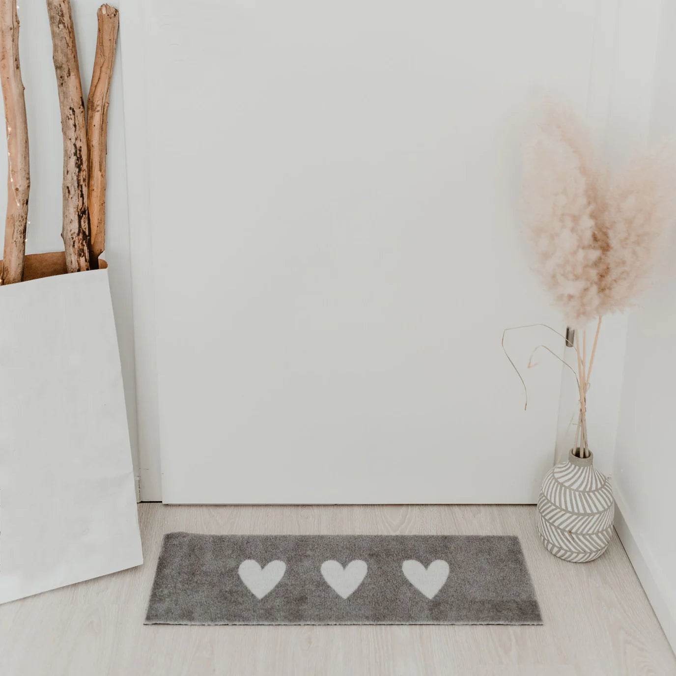 Die Oberfläche unserer waschbaren Fußmatte Kleine Herzen besteht aus High Twist Polyamid-Fasern, die sich durch die gedrehte Struktur besonders angenehm und weich anfühlt. Die Rückseite besteht aus rutschfestem PVC, was die Fußmatte sicher an ihrem vorgesehenen Ort fixiert. Das kompakte Format von ca. 75 x 25 cm ist ideal für den Eingangsbereich, für vor der Terassen- oder Balkontür oder vieles mehr!