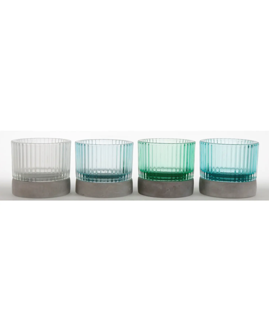 - Stilvolles Design: Auf einem breiten grauen Zementsockel stehend überzeugen die vier Windlichter in den Farben hellgrau, Türkis, aquamarin und Petrol mit ihrer außergewöhnlichen Aufmachung. Einzelne schmale Längsstreifen sorgen dabei für eine besondere Haptik.